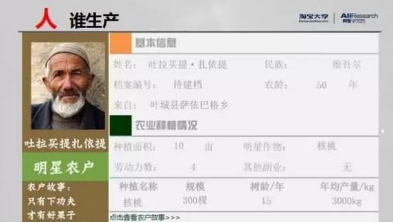今天互聯網的消費者在看產品時,更愿意相信一種場景。場景就是環境,以及是誰在生產這款產品。這其實就是農產品溯源,一方面我們用科技手段溯源,另一方面也需要用原始和質樸的方法,把生產者的信息傳遞給消費者。于是我們為農戶建立了個人檔案,比如這個維吾爾族種核桃的老大爺,需要很多信息,包括種植了多少核桃、樹齡是多少、每年的產量是多少、種了多少年核桃等等。我相信很多消費者愿意為這樣的背書買單。