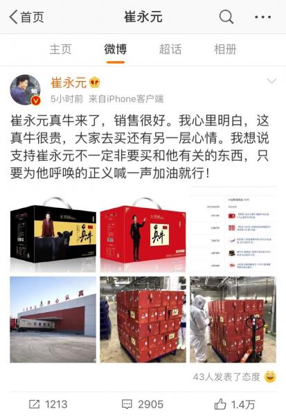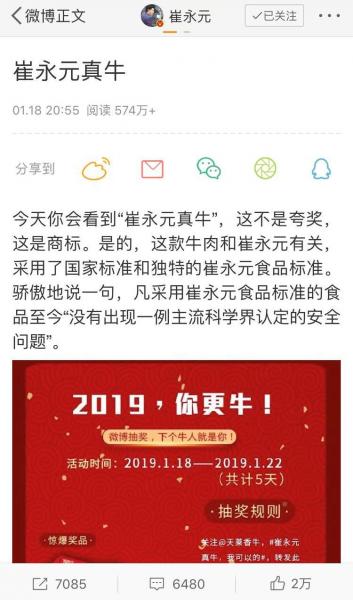 1 月 18 日,崔永元在微博上發布長文《崔永元真牛》,正式宣布開賣牛肉。同期,該篇文章在“崔永元真牛”微信公眾號上推送。