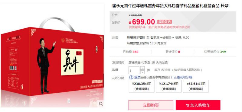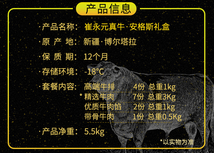 “崔永元真牛”均為禮盒裝,目前有兩種規格:4.5 千克,699 元,每公斤超150 元;5.5 千克,1999 元,每公斤超 360 元。