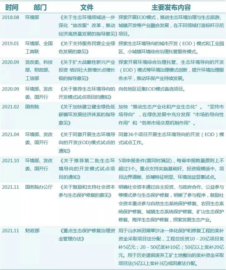 于是,基于項目實踐的EOD模式應運而生。環(huán)境部從2018年即開始提出了EOD模式的倡議,時至今年,多部委陸續(xù)出臺EOD相關政策,中央重視程度逐增。