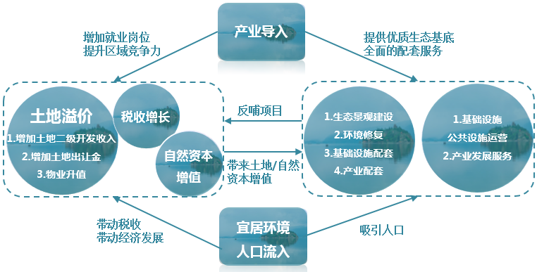 總結來說,EOD項目操作模式就是通過生態(tài)網(wǎng)絡建設、環(huán)境修復、基礎設施配套以及產(chǎn)業(yè)配套建設促使該區(qū)域及周邊的土地升值,并為產(chǎn)業(yè)引入和人口流入提供良好的生態(tài)基底;一方面以產(chǎn)業(yè)發(fā)展增加居民收入、企業(yè)的利潤和政府的稅收;另一方面依靠人口流入帶來政府稅收的增加及區(qū)域經(jīng)濟的發(fā)展。最終實現(xiàn)生態(tài)建設、經(jīng)濟發(fā)展、社會生活三者協(xié)調(diào)發(fā)展。