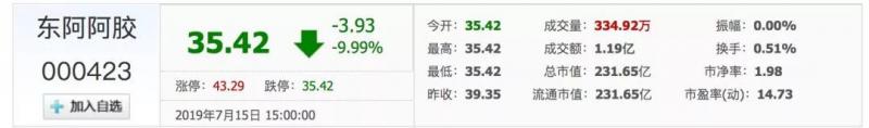 7月15日,東阿阿膠開盤便一字封死在跌停板,截至收盤,跌停價上尚有近14萬手賣單未能出逃。