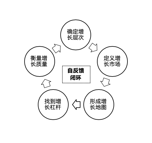 這三個(gè)問題,其實(shí)可以形成一個(gè)整體系統(tǒng)的業(yè)務(wù)層面的增長邏輯,它有五個(gè)核心步驟,我將其稱為——確定增長層次、定義增長市場、形成增長地圖、找到增長杠桿、衡量增長質(zhì)量,五個(gè)步驟形成一個(gè)自反饋閉環(huán)。