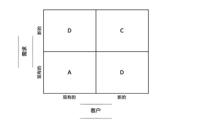 定義市場,本質(zhì)上是定義需求。在發(fā)現(xiàn)市場增長的空間下,想象力、創(chuàng)造力和邏輯分析框架一樣重要,所以我們給出一個(gè)2乘2矩陣,它刻畫出你潛在市場容量的新大陸到底在哪兒,它是你所有需求細(xì)分市場的總和。