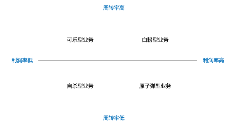 從周轉(zhuǎn)率和利潤率的象限看,有四種類型的業(yè)務(wù):“白粉型”,“原子彈型”,“可樂型”和自殺型。