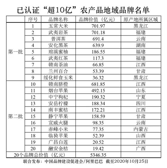 加上9月豐收節(jié)發(fā)布的五常大米、武夷巖茶、普洱茶等9個品牌,截至目前,經(jīng)認(rèn)證的“超10億”農(nóng)產(chǎn)品地域品牌達(dá)到20個,品牌總價(jià)值高達(dá)5346.35億。
