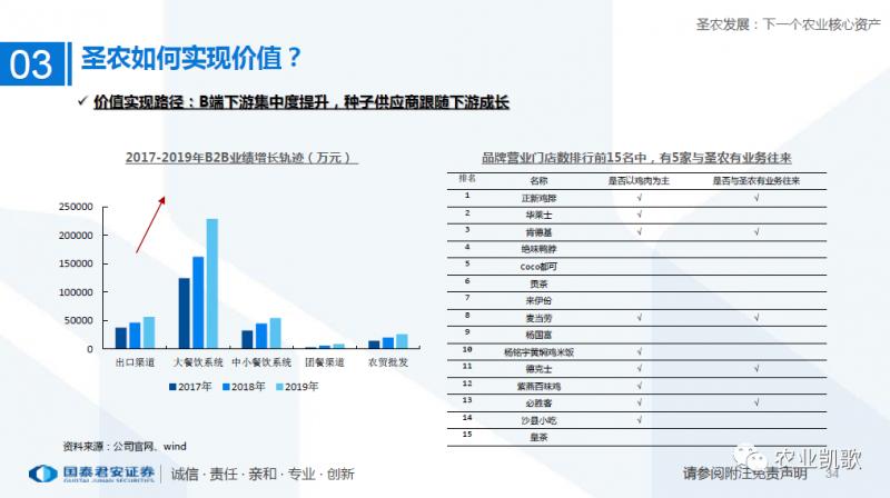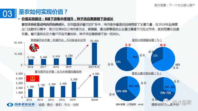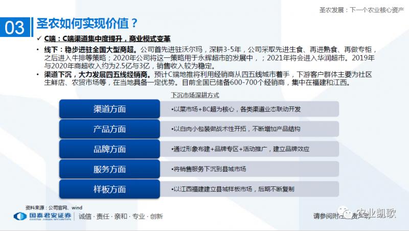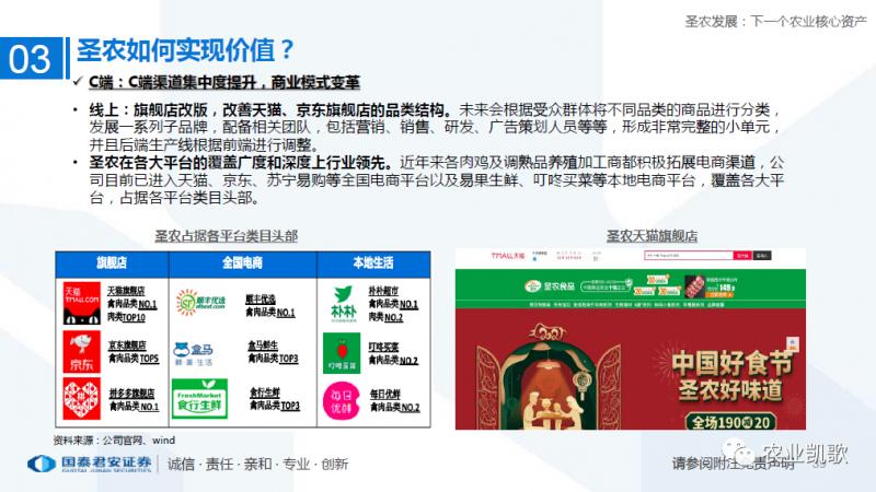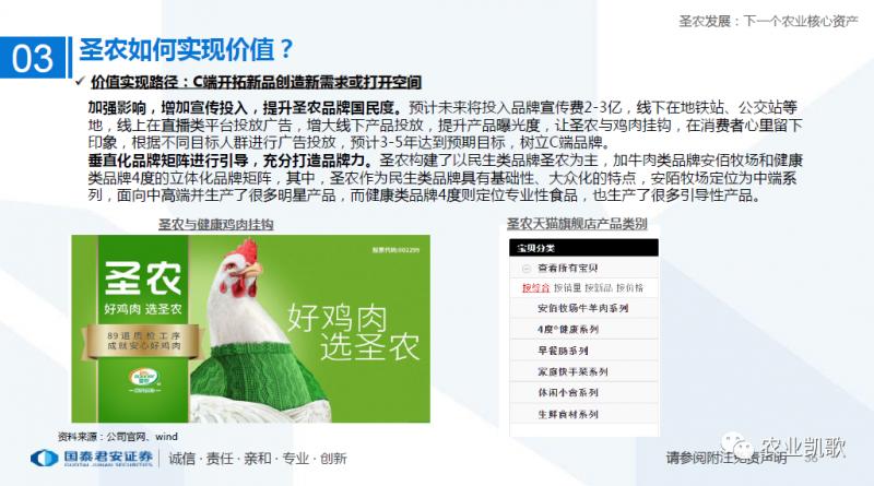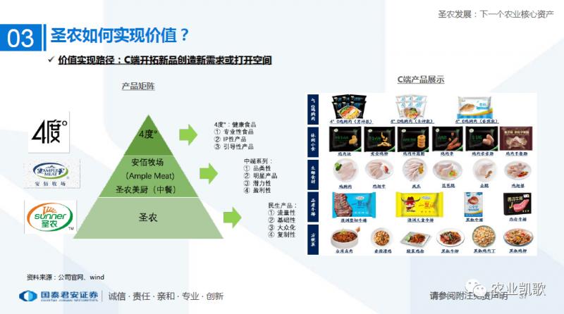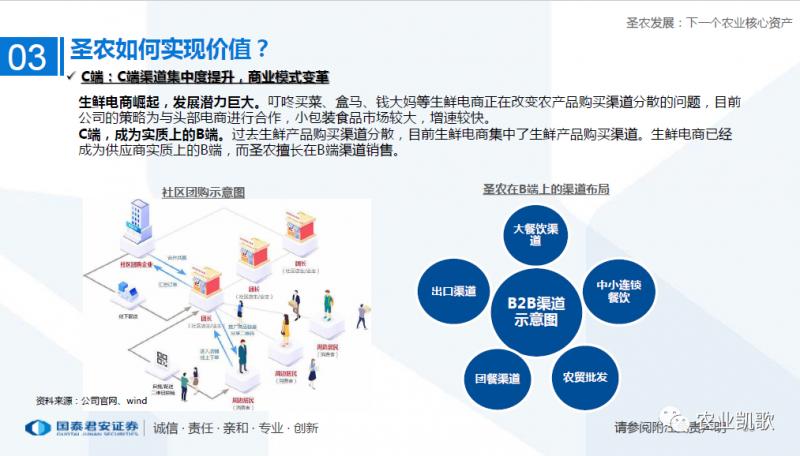 B端持續發力,C端不斷擴張。產業政策推動餐飲企業連鎖化和食品工業化,后端供應鏈的效率提升需求使中央廚房行業迎來加速發展期。圣農作為B端的傳統種子選手,憑借高質量產品和明顯的渠道優勢,為客戶提供優質服務,成為餐飲企業專業的中央廚房,B端將迎來確定性增長機會。此外,C端渠道、產品、品牌三維出擊,渠道----C端渠道集中度隨生鮮電商等新模式興起正在集中,成為實際的B端,圣農具有先天優勢,產品----新產品、新場景推動新消費,創造新需求,有望打開增長極,品牌----加大投入,與渠道一起或將沉淀圣農好雞肉品牌。