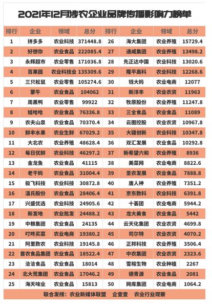 由農業新媒體聯盟、企查查、農業行業觀察聯合新三農、農地圈、吾谷網、北方農資、新農資360、環保養殖、薪火生態、食業頭條、品牌農業與市場、投農業、土壤改良及修復、鄉村振興100人、農業大佬那些事兒、返鄉創業說、神農島、薪火生態等新媒體、數據機構共同發布的2021年12月份“全國涉農企業品牌傳播影響力”TOP50榜單正式出爐正式發布。拼多多、好想你、永輝超市、百果園獲得前三名;蒙牛、大北農、極飛科技、中糧集團、叮咚買菜、先正達、阿里數農、北大荒集團、牧原股份、三全食品、云天化、新洋豐、德青源等農業科技、農業食品企業紛紛入榜。
