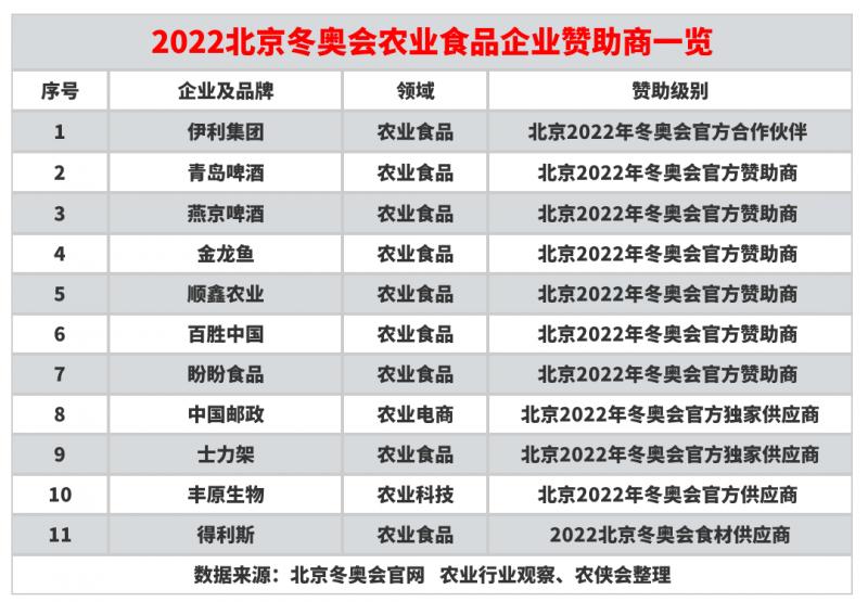 除了中國女足之外,2022冬奧會也成為了農業企業打造品牌、提升知名度的大機會。比如,伊利集團、青島啤酒、燕京啤酒、金龍魚、順鑫農業、盼盼食品、百果園等企業紛紛入局奧運營銷。