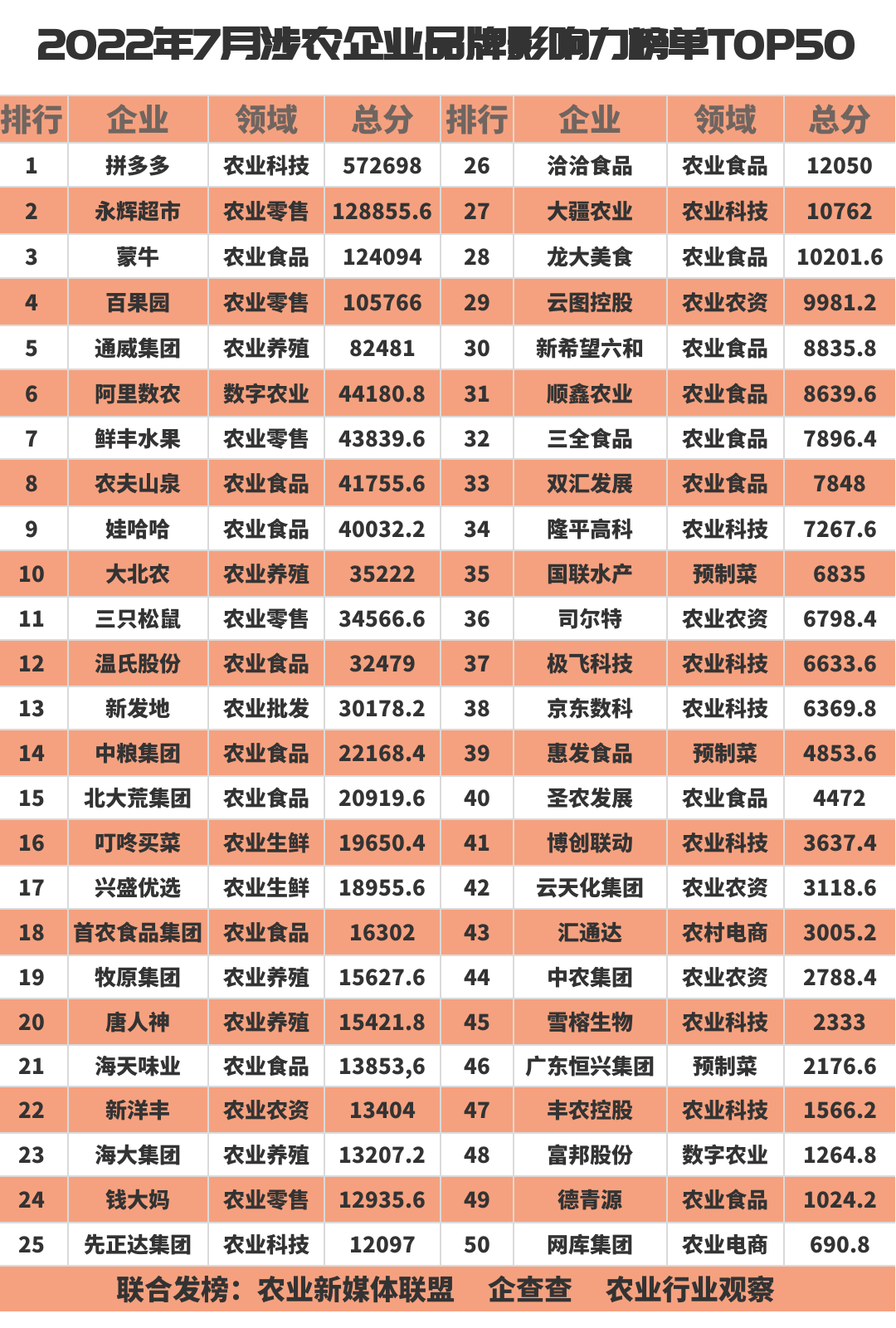 最近,農業行業觀察、企查查、農業新媒體聯盟聯合發布了《共譜鄉村振興·中國涉農企業品牌影響力榜單TOP50(第7期)》,在50多家涉農企業的品牌輿情監測、自媒體運營、搜索引擎數據及口碑影響力排名結果中,拼多多、永輝超市、蒙牛摘得榜單前三名,另外,前十名中均來自農業食品、農業養殖、農業科技、生鮮、農業食品等細分賽道,比如,百果園、通威股份、阿里數農、鮮豐水果、農夫山泉、娃哈哈、大北農等品牌紛紛入榜。