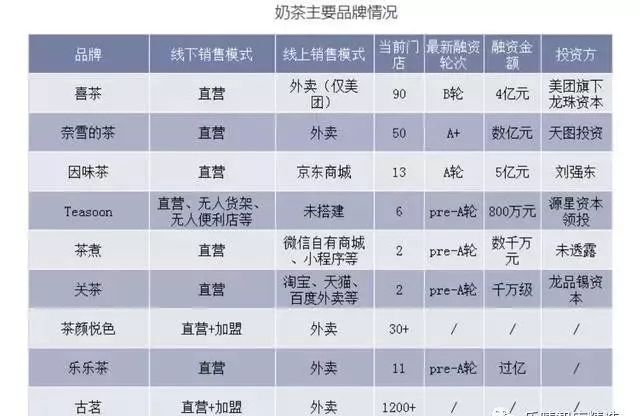 其中,2018年4月,喜茶完成了B輪融資,美團點評旗下的龍珠資本投資4億元,將重點增加產能、提升供應鏈管理以及實現后臺信息化,目前喜茶在全國的門店鋪設已經達到了90家;此前3月,奈雪的茶宣布獲得由天圖資本領投的數億元A+輪融資,估值達到60億元。