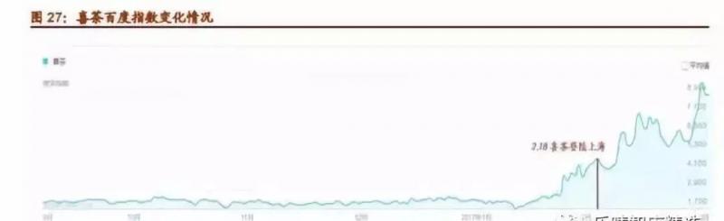 喜茶的百度指數在 1 月下旬開始逐步升溫,在正式開業之前已經在網絡平臺形成了一定的輿論熱度,二月下旬之后隨著“排隊經濟”引發更大熱潮。