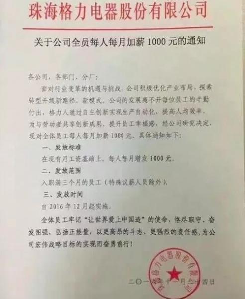 早在2016年底,一則《格力公司全員每人每月加薪1000元的通知》在網上流傳: