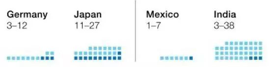 注:從左至右國家分別:德國、日本、墨西哥以及印度。淺藍色方塊表示在自動化發(fā)展迅速的情況下,各國分別將有1200萬、2700萬、700萬、3800萬的人口將需要重新就業(yè)并學習新的技能;深藍色方塊表示在自動化發(fā)展相對緩和的情況下,各國分別將有300萬、1100萬、100萬、300萬人需重新就業(yè)。