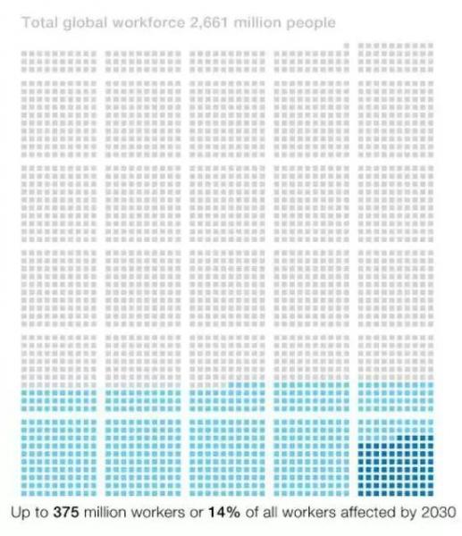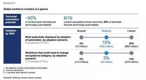 麥肯錫全球研究院(McKinsey Global Institute)剛剛發(fā)布的報告中稱,隨著科技的進步,未來全球大概有3.75億人口將面臨重新就業(yè),其中中國占1億。