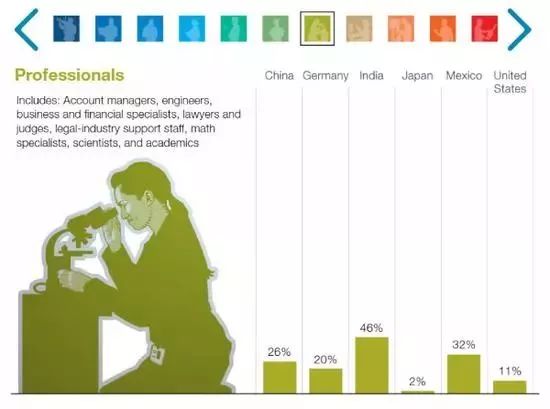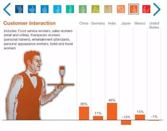 注:在創(chuàng)意人員(藝術(shù)家、設(shè)計師、娛樂業(yè)從業(yè)者、媒體工作者)大類中,中國崗位需求將增長85%。(下列圖片均來自麥肯錫,以下11張圖中的柱形圖從左至右代表的國家分別為中國、德國、印度、日本、墨西哥以及美國。)