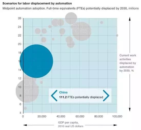 注:橫坐標代表不同國家的2010年的GDP總值,縱坐標代表2030年各國目前的工作被自動化取代的比例。深藍色圓圈代表中國,表示2030年,中國預計有1.112億人的工作被自動化所取代。