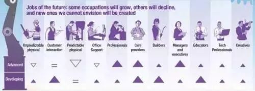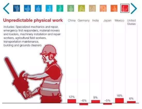 麥肯錫報告中分了11個行業(yè)大類,看不同國家未來在這些行業(yè)的崗位需求變化。其中涉及到創(chuàng)意工作、技術(shù)類工程師、管理類以及社會互動類的崗位需求增長明顯,因為機器還無法在這些領(lǐng)域取代人類。另一方面,那些在可預測環(huán)境中進行物理活動的部分崗位需求將下降明顯。