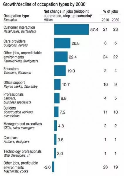 中國哪個職業(yè)受到的沖擊最大,可能很多人都想不到。麥肯錫認為,是機械師和廚師。到2030年,以這兩個崗位為代表的基礎(chǔ)工作會減少360萬。猜測可能是考慮到中餐的流水化生產(chǎn)趨勢,廚師的需求會大大減少。