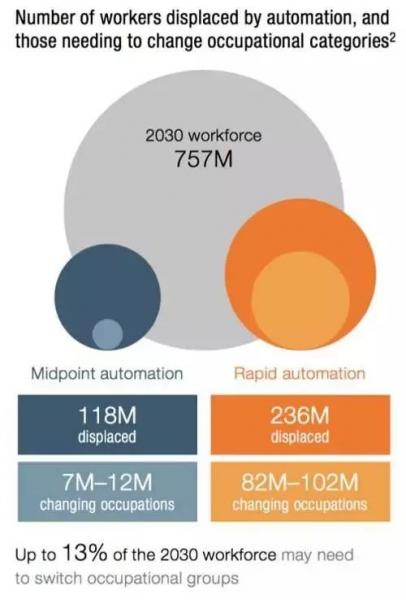 據(jù)麥肯錫的預測,到2030年,中國將有至少1.18億人的崗位被機器人取代,這要求他們學習新技能,適應(yīng)與機器人的合作分工;其中700-1200萬人需要轉(zhuǎn)換職業(yè)(這意味著他們原有的崗位徹底被機器人取代,不再有人工的價值)。如果人工智能以更樂觀的速度發(fā)展的話,這一數(shù)字將擴大到2.36億,也就是三分之一的中國人。