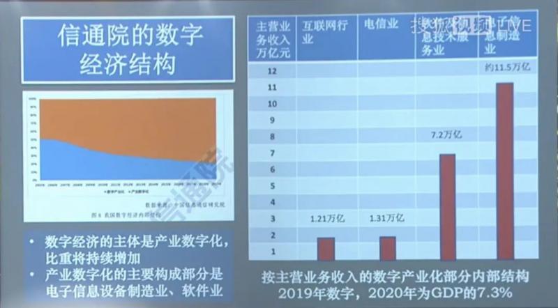 我這里有一張圖,講的是信通院的數(shù)字產(chǎn)業(yè)化和國家統(tǒng)計局的數(shù)字經(jīng)濟(jì)核心產(chǎn)業(yè)部分。數(shù)字產(chǎn)業(yè)化最主要的部分是電子信息設(shè)備制造業(yè)、軟件和信息技術(shù)服務(wù)業(yè),然后是電信產(chǎn)業(yè),再后才是互聯(lián)網(wǎng)產(chǎn)業(yè),當(dāng)然互聯(lián)網(wǎng)產(chǎn)業(yè)最近又產(chǎn)生了一些新的東西。而國家統(tǒng)計局?jǐn)?shù)字經(jīng)濟(jì)核心產(chǎn)業(yè)部分,又在這個部分增加了制造業(yè)中數(shù)字和智能含量,把特別高的部分劃到了核心產(chǎn)業(yè)部分。所以,2020年是7.3,我們“十四五”計劃是7.8。