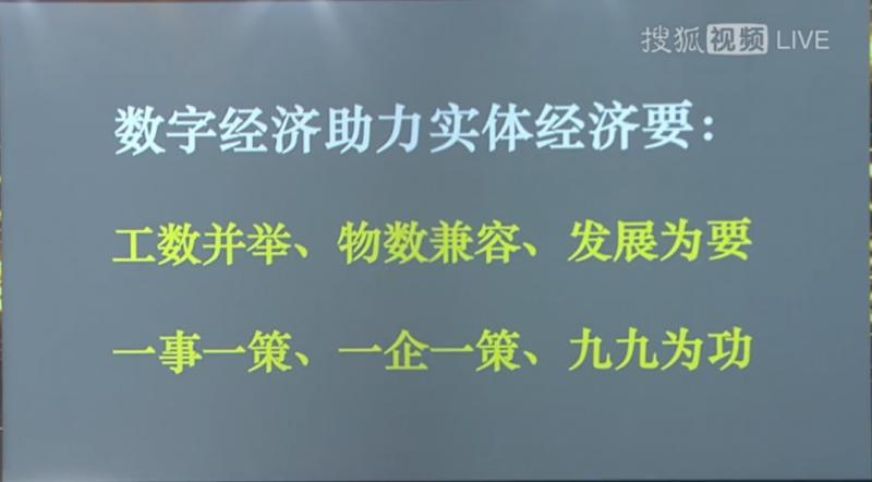 他認(rèn)為,數(shù)字經(jīng)濟(jì)助力實(shí)體經(jīng)濟(jì),融合的概念是最重要的,工業(yè)技術(shù)和數(shù)字技術(shù)要并舉,數(shù)字、能量、物質(zhì)要兼容。為了什么?為了企業(yè)的發(fā)展、為了國家的發(fā)展。它的實(shí)現(xiàn)是在一個一個事物中實(shí)現(xiàn)的,所以要一事一策,而我們經(jīng)濟(jì)的主體是企業(yè),所以要一企一策,而且要久久為功,不要指望這樣的轉(zhuǎn)變過程是很快的,一蹴而就是不可能的。