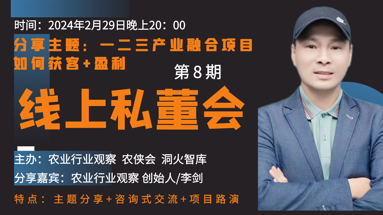 2024年2月29日(周四)晚上20:00,中國農業產業分析師、連續創業者、農三代、商業模式構架師、農業行業觀察創始人李劍老師將親情分享,以“一二三產業融合項目如何獲客+盈利”為主題啟動第8期私董會(線上),幫助農業農村老板、創業者、投資者、經營者破解一二三產業融合項目獲客、盈利、商業創新、創業等問題...