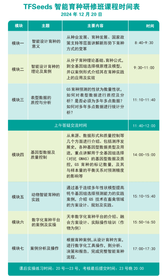隨著農(nóng)業(yè)科技的飛速發(fā)展,我們即將迎來一個(gè)全新的育種時(shí)代——育種4.0。在此,我們榮幸地宣布,備受期待的“動(dòng)植物智慧育種全面講解:TFSeeds智能育種研修”高級研修班即將于2024年12月20日(周五)隆重開班!
