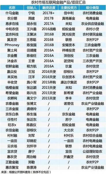 當(dāng)前農(nóng)村金融市場(chǎng)的主要參與主要包括4類,除了本土的信用社、城商行等傳統(tǒng)金融結(jié)構(gòu),還有新希望集團(tuán)、大北農(nóng)集團(tuán)等大型傳統(tǒng)三農(nóng)產(chǎn)業(yè)服務(wù)商;京東、阿里、蘇寧、一畝田等互聯(lián)網(wǎng)電商平臺(tái);翼龍貸、宜信、開鑫貸等P2P平臺(tái)。同時(shí),融資情況如下: