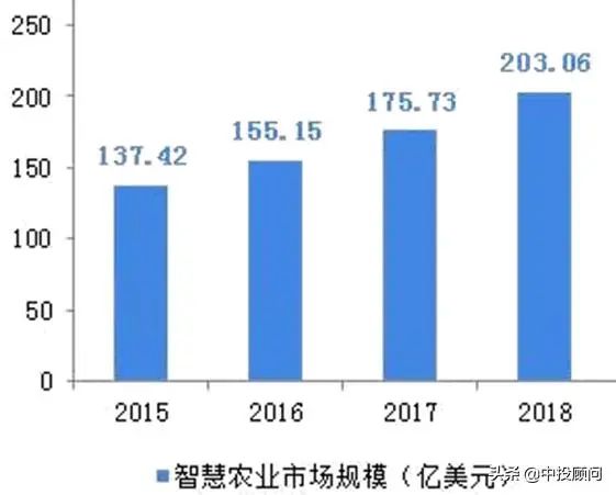 目前提倡的現代農業精細化生產與物聯網技術結合有著巨大的市場需求空間,以感知為前提,人與人、人與物、物與物全面互聯的網絡平臺構筑成功,現代農業悄然步入物聯網時代,智慧農業大局初現。中投產業研究院發布的《2020-2024年中國智慧農業深度調研及投資前景預測報告》顯示,中國智慧農業的潛在市場規模由2015年的137億美元增長至2018年的203億美元,并且有望繼續增長。
