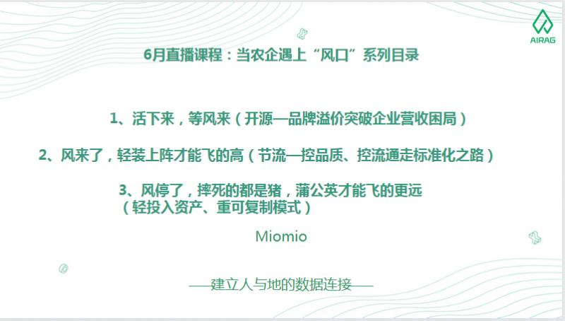 為了更好解密大氣候賦能農業、打造農產品品牌的切入點及方法論,農業行業觀察聯合大氣候集團開設以“當農企遇上‘風口’系列目錄”為主題3堂干貨級且實戰性強的直播課程,希望一起推動互聯網+農業的新商業、新機會...