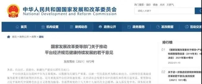 據(jù)發(fā)改委網(wǎng)站1月19日消息,國(guó)家發(fā)展改革委等部門發(fā)布《關(guān)于推動(dòng)平臺(tái)經(jīng)濟(jì)規(guī)范健康持續(xù)發(fā)展的若干意見(jiàn)》。