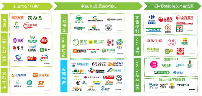 目前農產品的銷售模式主要有三種:農戶直接對接消費者;限定產品國家統一收購;轉化為品牌產品一體化銷售。而溢價能力最高的便是最后一種。以生鮮為例,通過農產品向品牌產品的轉換,上游端從農戶變成食品企業,對原料進行嚴格把控,中游加入分化為線上和線下雙渠道共行,降低運輸損失,下游端根據不同的消費場景,調配商品,擴大市場范圍。