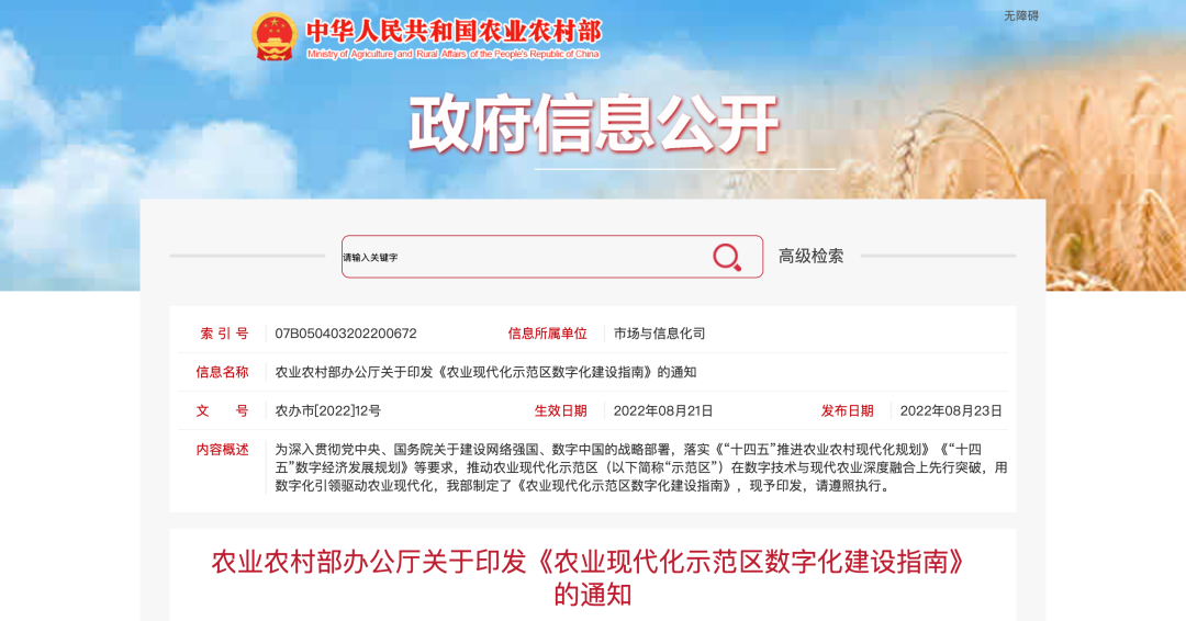 為深入貫徹黨中央、國務院關于建設網絡強國、數字中國的戰略部署,落實《“十四五”推進農業農村現代化規劃》《“十四五”數字經濟發展規劃》等要求,推動農業現代化示范區(以下簡稱“示范區”)在數字技術與現代農業深度融合上先行突破,用數字化引領驅動農業現代化,近日,農業農村部印發《農業現代化示范區數字化建設指南》(以下簡稱《指南》),明確了農業現代化示范區數字化建設的總體要求和保障措施,并就重點任務作出部署。