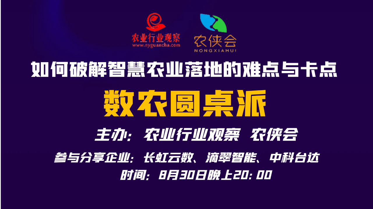 2023年8月30日(周三)晚上20:00,農(nóng)業(yè)行業(yè)觀察、農(nóng)俠會(huì)主辦數(shù)農(nóng)圓桌派特邀長(zhǎng)虹云數(shù)、滴翠智能、中科臺(tái)達(dá)等智慧農(nóng)業(yè)公司圍繞“如何破解智慧農(nóng)業(yè)落地的難點(diǎn)與卡點(diǎn)”的話題進(jìn)行深度探討。