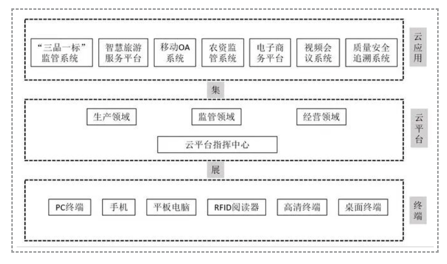 智慧農業園區架構主要分為三大板塊:云應用、云平臺、終端,如下圖所示。云應用是智慧農業園區的“四肢”,負責在智慧農業園區不同領域進行智慧化動作,在農業生產一線采集數據和監控管理。
