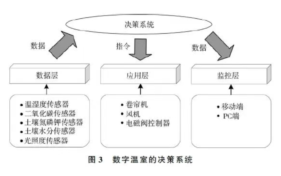 青州市YX溫室園藝有限公司,為花卉、蔬菜、種苗繁育、養(yǎng)殖及畜牧業(yè)等眾多領(lǐng)域的數(shù)字溫室工程設(shè)計(jì)與承建提供全面解決方案。該系統(tǒng)通過(guò)先進(jìn)的信息采集設(shè)備,如溫濕度傳感器、二氧化碳傳感器、土壤電導(dǎo)率傳感器等,實(shí)時(shí)監(jiān)測(cè)溫室內(nèi)部的環(huán)境狀態(tài),確保數(shù)據(jù)的實(shí)時(shí)性和準(zhǔn)確性。在數(shù)據(jù)采集后,數(shù)字溫室系統(tǒng)通過(guò)其內(nèi)置的數(shù)字化模型進(jìn)行深入分析和處理。基于復(fù)雜的算法和數(shù)據(jù)分析技術(shù),系統(tǒng)能夠?qū)κ占降臄?shù)據(jù)進(jìn)行深度解析,識(shí)別出作物生長(zhǎng)的最佳環(huán)境條件,將分析結(jié)果進(jìn)一步轉(zhuǎn)化為具體的生產(chǎn)決策。智能溫室利用無(wú)線通信技術(shù)與智能農(nóng)機(jī)設(shè)備實(shí)時(shí)連接,根據(jù)系統(tǒng)提供的決策建議,智能農(nóng)機(jī)設(shè)備能夠自動(dòng)執(zhí)行相關(guān)的農(nóng)業(yè)操作,實(shí)現(xiàn)灌溉、施肥、通風(fēng)、遮陽(yáng)、加溫等多個(gè)方面的調(diào)節(jié),進(jìn)一步提升農(nóng)業(yè)生產(chǎn)的自動(dòng)化和智能化水平。同時(shí),系統(tǒng)通過(guò)軟硬件的融合,不僅優(yōu)化了作物生長(zhǎng)環(huán)境,還能收集農(nóng)田操作數(shù)據(jù)和作物收成等關(guān)鍵信息,形成一個(gè)完整的信息閉環(huán),為農(nóng)業(yè)生產(chǎn)提供持續(xù)的數(shù)據(jù)支持和優(yōu)化建議,該系統(tǒng)具體架構(gòu)如圖3所示。