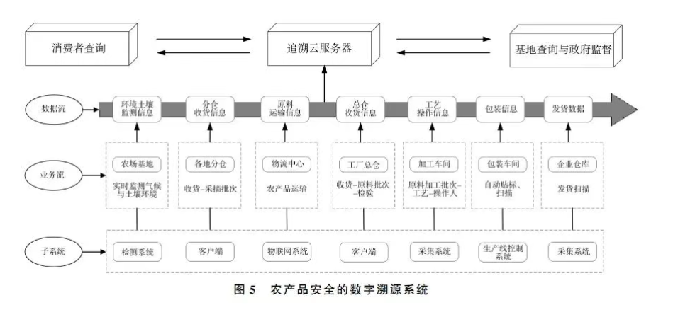 數(shù)字農(nóng)產(chǎn)品溯源本質(zhì)要實(shí)現(xiàn)農(nóng)業(yè)生產(chǎn)全過(guò)程的數(shù)字化管理與監(jiān)控,確保農(nóng)產(chǎn)品從田間到餐桌的全過(guò)程可追溯性,從而保障農(nóng)產(chǎn)品的質(zhì)量與安全。數(shù)字農(nóng)產(chǎn)品溯源的體系架構(gòu)從底層到頂層共有五個(gè)層級(jí)。一是運(yùn)行環(huán)境層,為系統(tǒng)提供硬件設(shè)備、操作系統(tǒng)、網(wǎng)絡(luò)環(huán)境等基礎(chǔ)運(yùn)行條件;二是網(wǎng)絡(luò)層,負(fù)責(zé)數(shù)據(jù)傳輸和網(wǎng)絡(luò)連接管理;三是基礎(chǔ)服務(wù)層,提供身份服務(wù)、區(qū)塊鏈服務(wù)、管理服務(wù)和安全服務(wù)等基本功能模塊;四是接口層,向上層應(yīng)用提供數(shù)據(jù)交互和共享的統(tǒng)一接口;五是應(yīng)用層,提供農(nóng)產(chǎn)品質(zhì)量追溯、安全生產(chǎn)管理、流通管理、質(zhì)量監(jiān)督管理等具體業(yè)務(wù)功能。基于該體系架構(gòu),數(shù)字農(nóng)產(chǎn)品溯源技術(shù)優(yōu)化了生產(chǎn)、加工、銷售等環(huán)節(jié),為政府部門的監(jiān)督管理、企業(yè)的可信流通體系建設(shè)提供技術(shù)支撐,整體提升了農(nóng)產(chǎn)品質(zhì)量和安全水平,有效緩解供需雙方的信息不對(duì)稱問(wèn)題。