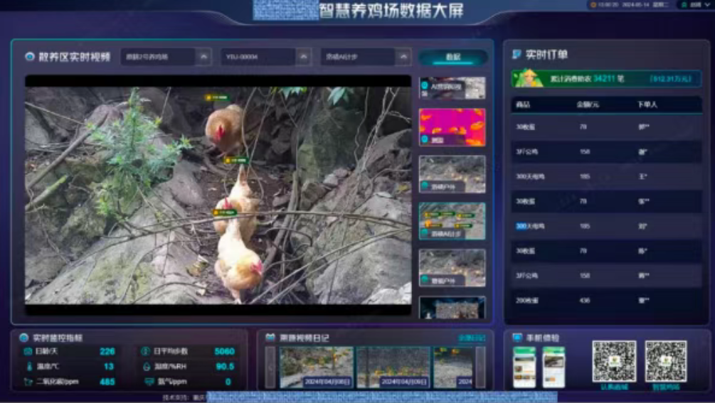 據介紹,該平臺創新構建了具備生產管理、溯源管理、營銷推廣等功能模塊的多端智慧養殖平臺,解決了散養雞行業規模化管理的痛點。通過智能設備,如體重傳感器、廣角攝像頭、溫濕度傳感器等,采集養殖作業現場各項關鍵指標數據,實現了養殖過程中的稱重、計數、體溫和環境監測等多場景應用。