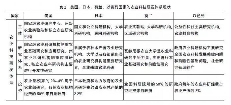 世界各國的農業科技研發系統組成主體多樣化,但都基本以政府、高校的農業科技研發機構為重要主體,且政府為主要管理者、研發推動者,企業的重要程度各國略有不同,其他農業相關者緊密配合主要研發機構。