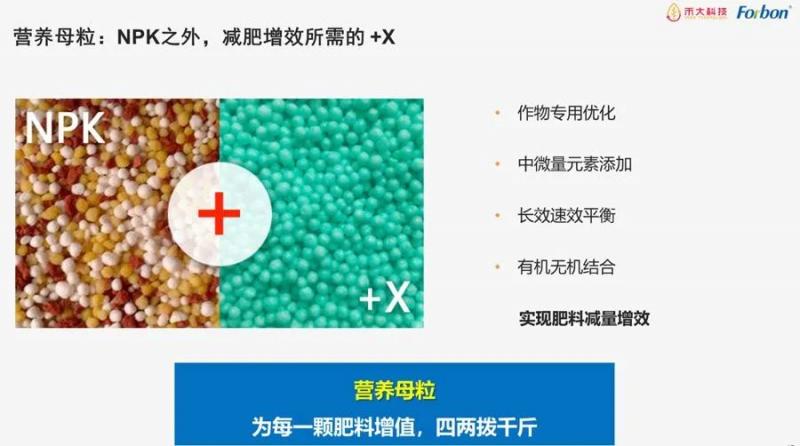 提到減肥增效,要減的肯定是大量元素NPK,過去一直過施的東西。增效的話,肯定要結合作物土壤的情況,然后去補充一些它所需的一些營養元素,然后才能實現這個目的。那因此的話,除了NPK之外,這個加x就顯得非常重要。就說除了NPK之外,還要再補的那個東西顯得非常重要。所以營養母粒也是由此而誕生的,營養母粒是營養一個載體。