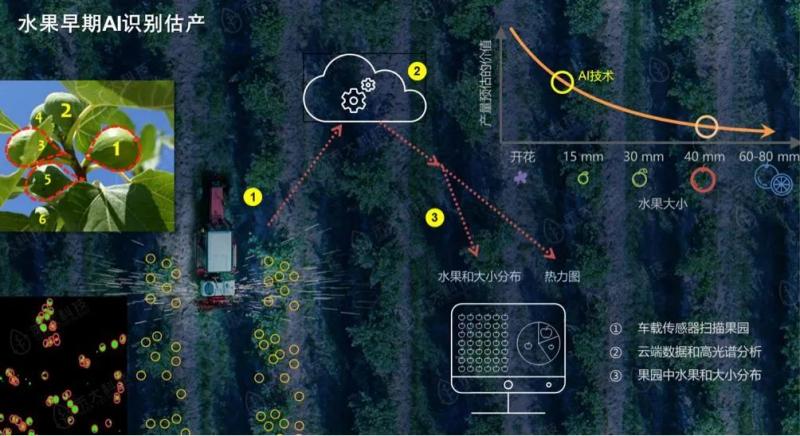 跟大家分享的一項技術,就是水果早期AI識別估產技術,通過傳感器在田間進行掃描,能夠把果實的整個產量分布進行一個獲得。在果實很小很小的時候。通過AI技術及圖像識別的技術,就能夠精準的判斷出那里有沒有果子,然后能把數量分布全部獲得。最后在一方面影響種植管理決策,另外一方面還可以為其他措施方面提供保障。
