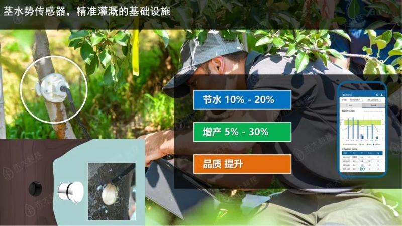 水,其實對于作物的影響也非常重要的,有時候它是比其它因素更加重要。那么我們怎么知道作物是否缺水呢?通過我們的一項技術,就是我們叫莖水勢傳感器,通過檢作物的根莖來判斷作物對水的需求,就能夠去做驅動灌溉設施,以便提供產品品質。所以說莖水勢傳感器也是我們精準灌溉系統中很重要的一個基礎設施。