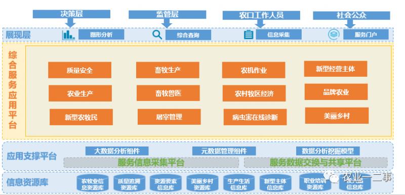 統一一下認知:農業大數據不僅僅指各個政府的大數據可視化大屏哦(據說帶應急指揮和決策支持功能),還應包括數據采集、存儲和管理。還有大數據未必一定要部署在私有云/公有云上,全部署在物理服務器也是可以的,所以大家別被騙去買云服務哦。