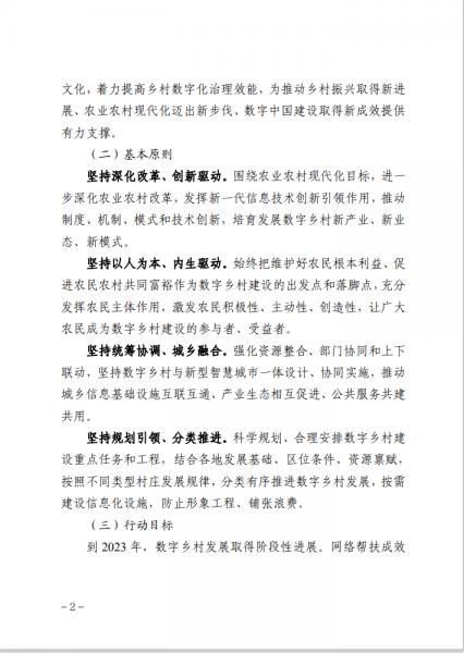 《行動計劃》提出,要堅持深化改革、創新驅動,堅持以人為本、內生驅動,堅持統籌協調、城鄉融合,堅持規劃引領、分類推進。到2023年,數字鄉村發展取得階段性進展。網絡幫扶成效得到進一步鞏固提升,農村互聯網普及率和網絡質量明顯提高,農業生產信息化水平穩步提升,“互聯網+政務服務”進一步向基層延伸,鄉村公共服務水平持續提高,鄉村治理效能有效提升。到2025年,數字鄉村發展取得重要進展。鄉村4G深化普及、5G創新應用,農業生產經營數字化轉型明顯加快,智慧農業建設取得初步成效,培育形成一批叫得響、質量優、特色顯的農村電商產品品牌,鄉村網絡文化繁榮發展,鄉村數字化治理體系日趨完善。