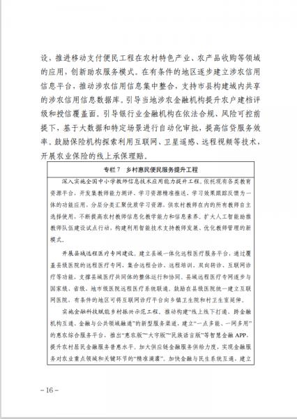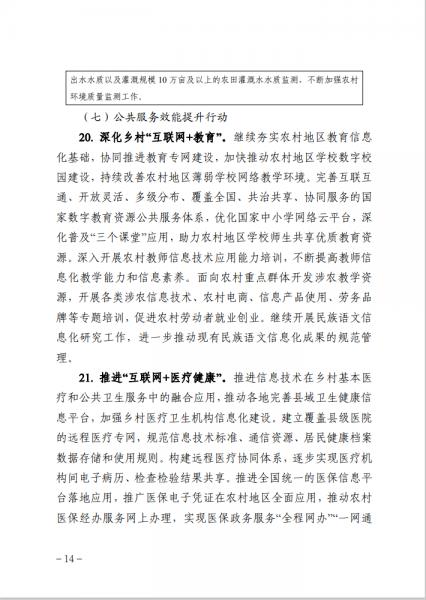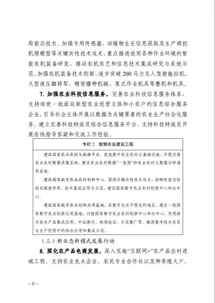 《行動計劃》部署了8個方面的重點行動。一是數字基礎設施升級行動,二是智慧農業創新發展行動,三是新業態新模式發展行動,四是數字治理能力提升行動,五是鄉村網絡文化振興行動,六是智慧綠色鄉村打造行動,七是公共服務效能提升行動,八是網絡幫扶拓展深化行動。同時,《行動計劃》還設立了鄉村基礎設施數字化改造提升工程等7項重點工程,作為落實上述行動的重要抓手。