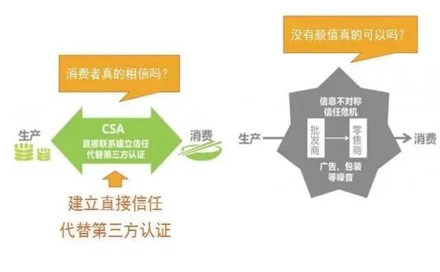 CSA模式,提供消費者與農場互動的機會,定期舉行一些節慶、務農活動,進行實地考察等,增進消費者與農場之間的信任,解決農場與消費者存在的信任危機問題。