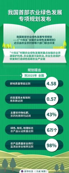規劃提出,到2025年全國耕地質量等級達到4.58,農田灌溉水有效利用系數達到0.57;主要農作物化肥、農藥利用率均達到43%;綠色、有機、地理標志農產品認證數量達到6萬個,農產品質量安全例行監測總體合格率達到98%。