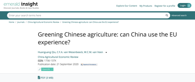近日,仇煥廣教授為第一作者在學(xué)術(shù)期刊《China Agricultural Economic Review》雜志發(fā)表題為“Greening Chinese agriculture: can China use the EU experience?”的文章(論文鏈接:https://doi.org/10.1108/CAER-10-2019-0186)。該研究探討了我國和歐盟的農(nóng)業(yè)發(fā)展面臨的環(huán)境挑戰(zhàn)及政策回應(yīng),并通過借鑒歐盟農(nóng)業(yè)綠色化發(fā)展的相關(guān)經(jīng)驗(yàn),為未來我國農(nóng)業(yè)可持續(xù)發(fā)展提供政策建議。