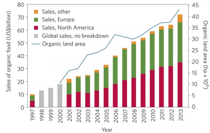 有機農場的數量,有機耕作土地的范圍,專門用于有機農業的研究經費以及有機食品的市場規模都在穩步增長。比如在1999年至2013年期間有機食品和飲料的銷售額增長了近五倍,達到720億美元。